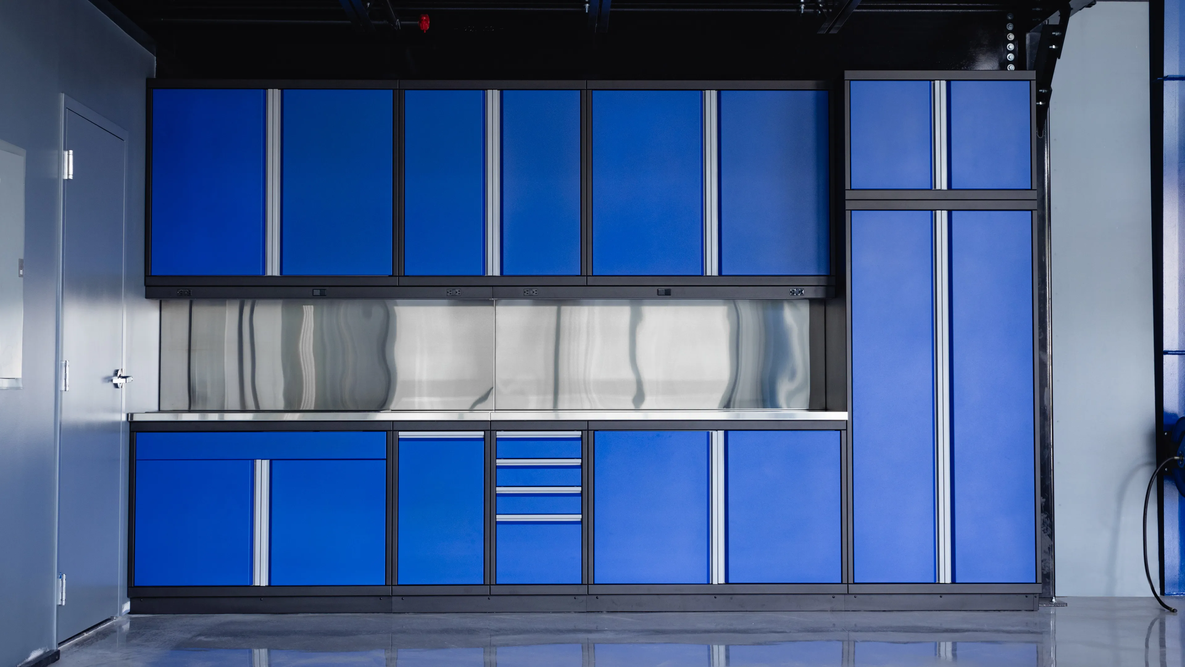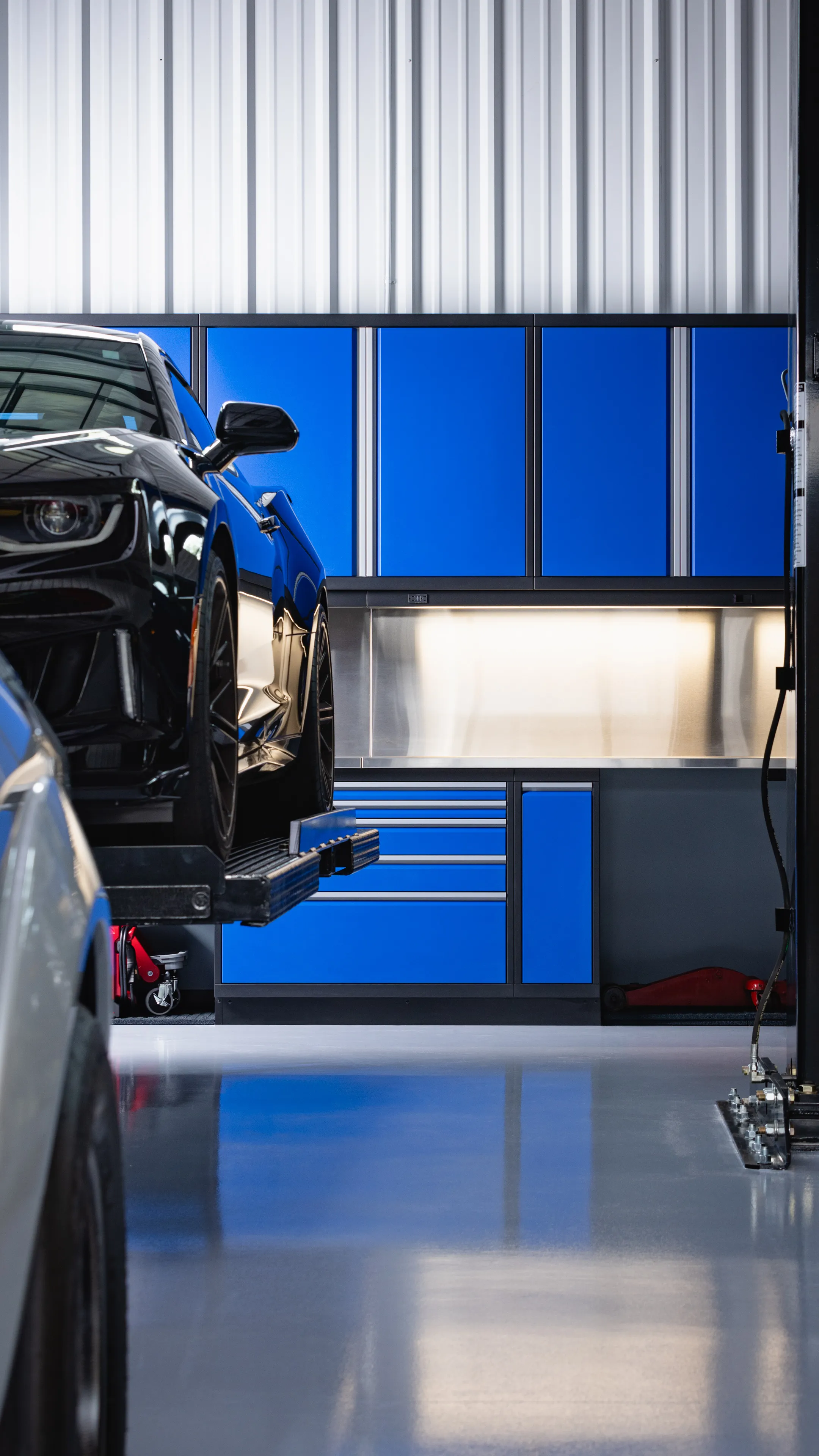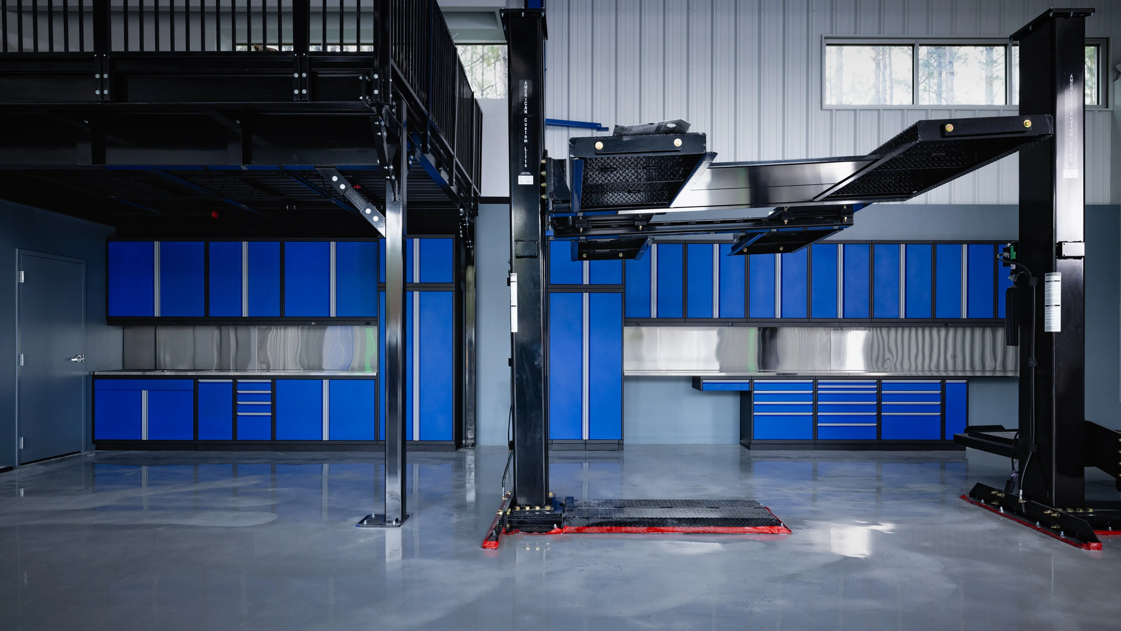 This project had it all. The upstairs mezzanine area had a lounge where we added a sink workbench along with storage lockers on the main level and workbench space for tools and detailing equipment.